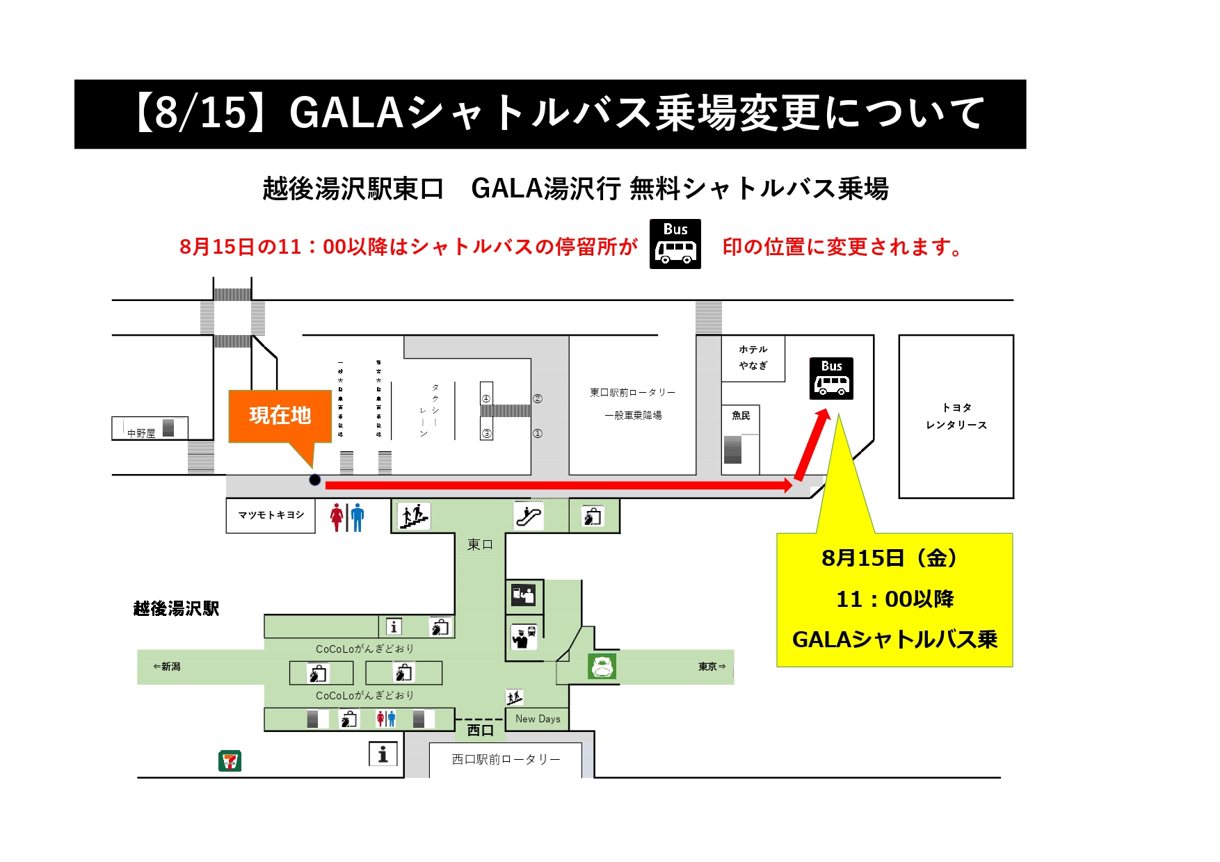 いつもGALAサマーパークをご利用いただきましてありがとうございます。8月15日(金)の11:00以降は越後湯沢駅東口での「ゆざわマルシェ」開催に伴い、シャトルバス乗り場が変更となります。通常、越後湯沢駅東口ですが下記画像の通り変更となります。