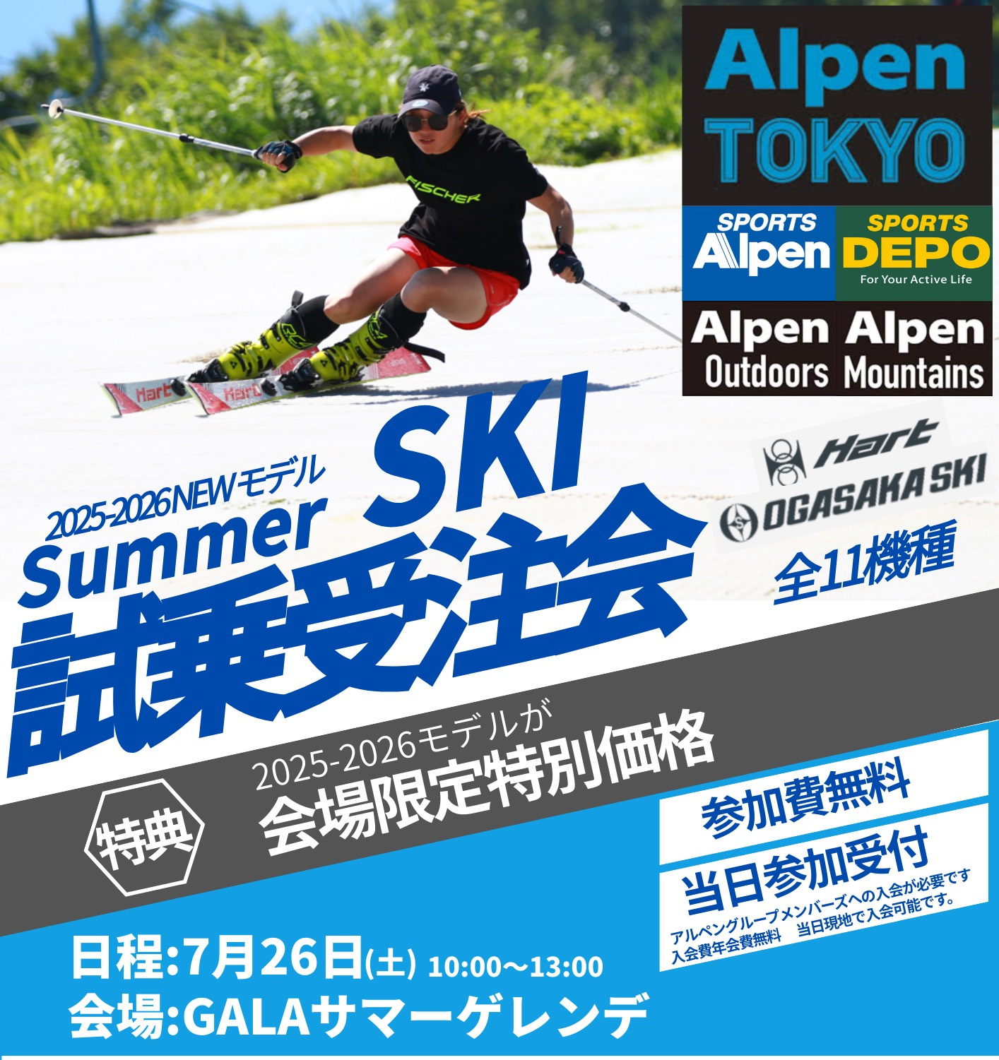 この夏、GALAサマーパークにて「アルペン」主催のサマースキー試乗会を3回開催いたします!最新モデルのサマースキー板を実際に試して乗り比べができるチャンスです。サマーゲレンデの相棒を探すのにもピッタリ!雪上とは一味違う“サマーゲレンデ”で、最新の性能をぜひ体感してください。