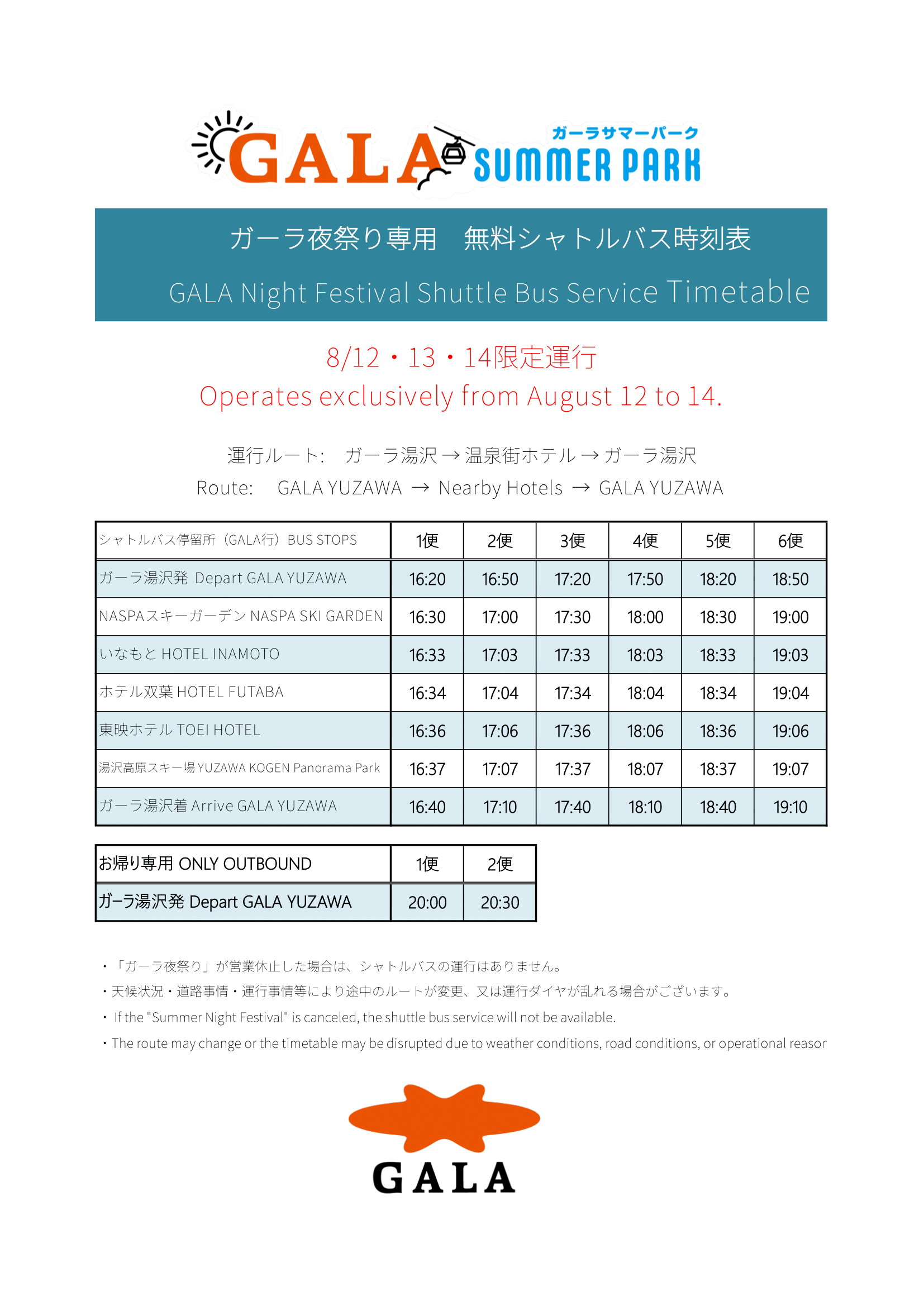 無料送迎バス時刻表 / Night Festival Shuttle Bus Service Timetable