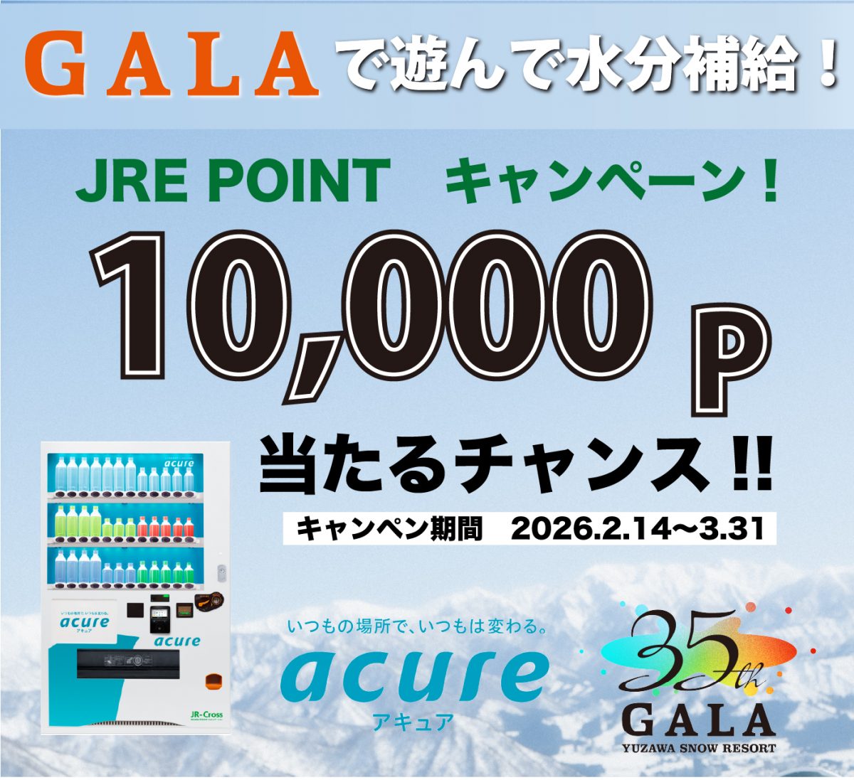 期間中のご来場いただいた同日に、JRE POINT WEBサイトに登録したSuicaを使って、GALA湯沢スキー場内で2,000円以上(税込)をご利用いただき、さらにGALA湯沢スキー場内にあるアキュアの自販機でドリンクを購入した方の中から抽選で10名様にJRE POINT10,000ポイントプレゼントいたします!