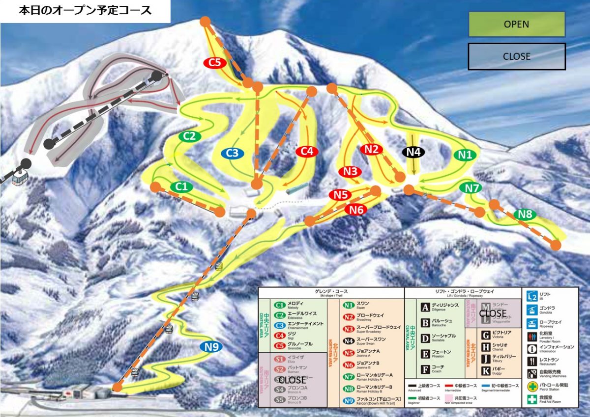 本日のOPENコースは中央エリア5コースと北エリア6コース、下山コース及び「ゆきあそびパーク」の予定です。