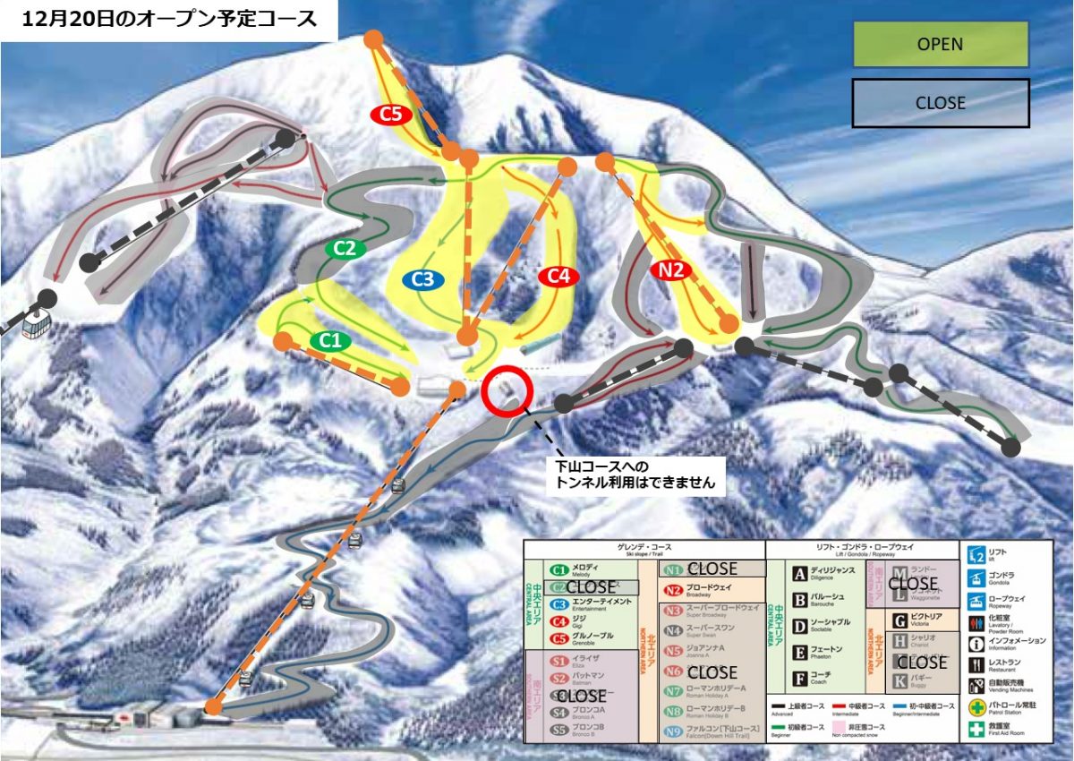 ご滑走いただけるコースは中央エリア4コース(メロディ、エンターテイメント、ジジ、グルノーブル)と北エリア1コース(ブロードウェイ)を予定しております。